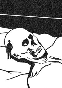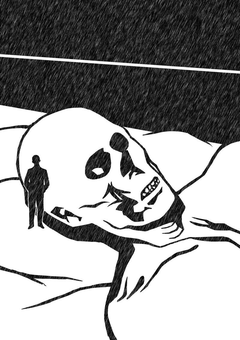 يؤخر الكلوروفورم خروج الهواء من الصدر في النفس الأول؛ الثاني، يجعل الفم يفيض باللعاب؛ والأطراف تتنمل، من الثالث حتى الرابع، الشفاه بمعية الأفكار تبدأ بالتضخم، ثم تبدأ الأمور الاستثنائية بالحدوث. هكذا اتخذت نشوة حفار القبور طريقها لمقبرة واسعة، كانت فيها ظهر اليوم عملية إزالة بقايا عظام لم تكتمل بسبب ضيق الوقت. كان ثمة نعش متروكٌ خلف السياج، وبجانبه، على الرمل، هيكل عظمي للرجل المحتجز بداخله. هل سمع شيئاً، حقا؟ فتح صاحبنا مزلاج الباب، دخل، ثم دار حول الرجل العظمي، جاثيًا على ركبتيه، ثبت بصره حول مدار الجمجمة. هناك، في مؤخرتها، فوق قاعدتها بقليل، و كقوس مربوط بخشونة بعظم مؤخرة الرأس، تكور رجل صغير الحجم، مرتجف، مصفر، تعلو وجهه التغضنات. على فمه كدمة، وعيناه غائرتان عميقًا، يعلو نظرته قلق مجنون. هذا هو كل ما تبقى من الكوكائين.
