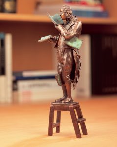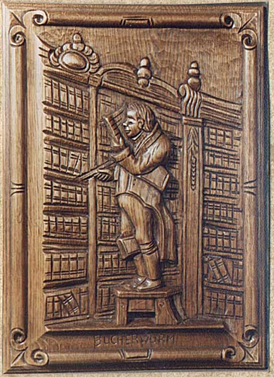 اللوحة زيتية على قماش، مقاساتها 50 سم x 27 سم، معروضة في متحف جورج شايفر بمدينة شوينفورت بألمانيا، رسمها عام 1850، بعد حوالي عشر سنوات من رسم لوحته السابقة، تشخص رجلًا متسلقًا سلمًا خشبيًا في مكتبة ليبلغ أعلى الرفوف، يمسك كتابًا مفتوحًا بيمينه وآخر بشماله يدنيه من عينيه يقرأ منه، وثالثًا تحت إبطه، وآخر بين ركبتيه. يتدلى من جيب سرواله الخلفي منديل يمسح به الغبار العالق بالكتب.